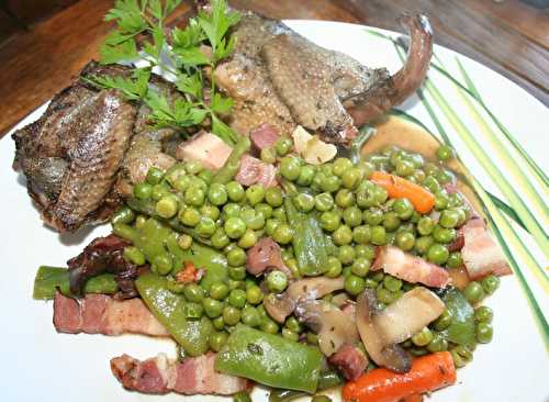 Pigeons aux petits pois et légumes du jardin Ingrédients : 2 jeunes pigeons, 200 g de petits pois, 1 tranche de poitrine fumée, 1.