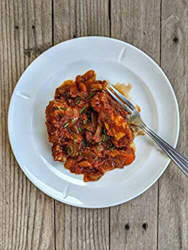 Recette du poulet basquaise aux piments doux et poivrons, oignons, vin blanc, tomates.