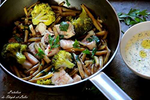 Ingrédients pour 4 personnes 4 filets de cabillaud 500 g de brocolis frais 500 g d'haricots beurre frais 2 gousses d'ail hachées 1 botte de persil plat 25 cl de crème fraîche liquide Huile d'olive Sel, poivre noir du moulin Préparation: Équeutez et.