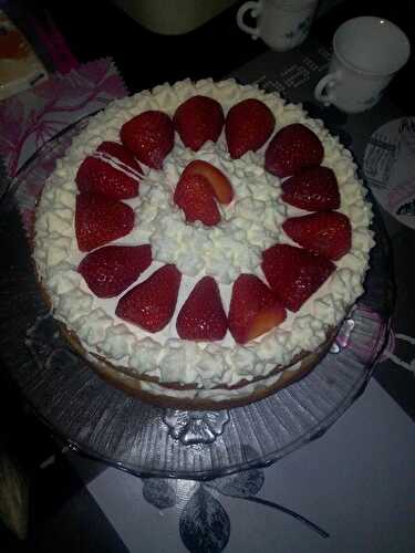 Un bon gâteau aux fraises avec une crème toute en légèreté ! Pour le gâteau : 4 oeufs 140 g de sucre en poudre 90 g de beurre 120 g de farine 1 sachet de levure chimique Pour la garniture : .