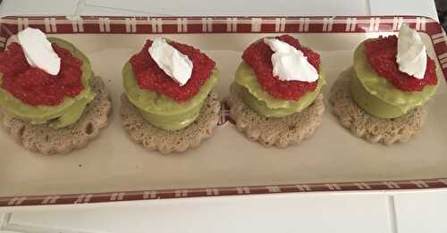 Ingrédients : 2 avocats, 1 citron, 4 tranches de pain de campagne, 2 feuilles de gélatine, 1 verrine d'oeufs de lompe, .