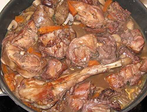 Un plat simple, savoureux et réconfortant, à déguster en famille autour d'une bonne bouteille de vin - la cuisine des délices - Préparation : 30 min - Cuisson : 120 min - pour 4 à 6 personnes - 1 beau lapin, 1 boite de champignons de Paris, Quelques.