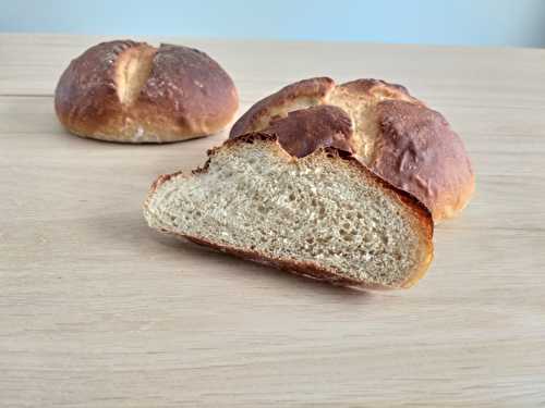 Pour 3 pains de 270 g environ Pétrissage: 10 mn Repos: 3 h 30 Cuisson: 25 mn 500 g de farine T 65 280 g d'eau à 20°C 100 g de levain liquide ou 25 g de levain déshydraté 10 g de levure boulangère fraîche 10 g de sel 80 g de sucre roux Dans la cuve de.