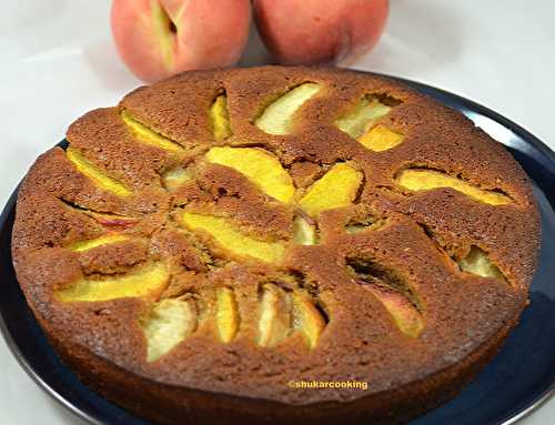 120 g de farine 1 paquet de levure chimique 100 g de sucre de fleur de coco 125 g de noix de coco en poudre 130 g de lait ½ écrémé 125 g de beurre fondu 3 œufs 3 pêches Chauffer le four à 200°C.