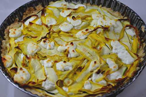 125 g de beurre 5 càs d’eau 1 cas d’huile 250 g de farine sel 2 petites courgettes jaunes 1 courgette verte 200 g de fromage chèvre frais Chauffer le four à 210°C.