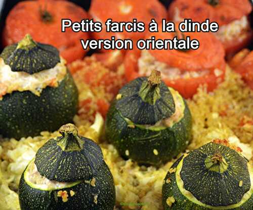 4 tomates à farcir 4 courgettes rondes 4 filets de dinde 150 g de boulgour 1 càc de coriandre surgelée 1càc de cumin moulu 1 càc de coriandre moulue sel Mettre le boulgour dans un bol et le recouvrir d’eau bouillante, ajouter la coriandre surgelée (.