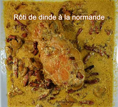 Pour 3 à 4 : 1 rôti de dinde de 500 g 1 oignon 1 échalote 100 g de lardons 1 bouillon cube de volaille 200 g champignons de paris (ici en boite) 250 ml de crème entière fluide à 15 % 1 verre à liqueur de calvados 120 ml de cidre brut sel huile d'olive.