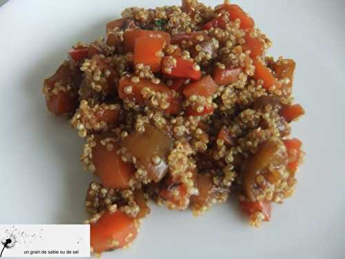 Ingrédients pour 2 personnes 50 gr de quinoa cru 150 gr de courgettes 1 poivron vert, rouge ou jaune 150 gr de carottes 20cl d’eau 1 Kub or curry Préparation Faire chauffer l’eau …