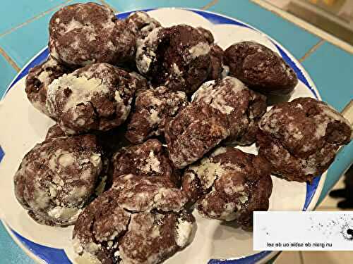 Biscuits craquelés au chocolat Ingrédients : 125 gr de chocolat noir pour moi noir absolu 35 gr de beurre 35gr de sucre 1 œuf 100 gr de farine 1 cuillère à café de levure chimique ou…