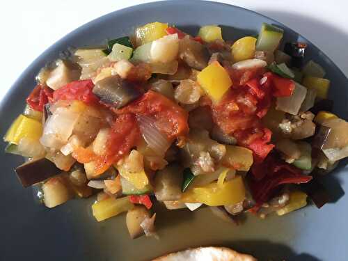 Ingrédients : pour 4 personnes 1 poivron rouge 500 g de tomates 1 belle aubergine 2 courgettes 3 oignons frais 2 gousses d’ail Basilic, thym et romarin frais du jardin 2 cuillerées à soupe d’huile d’olive Sel, poivre du moulin et piment d’Espelette 4.