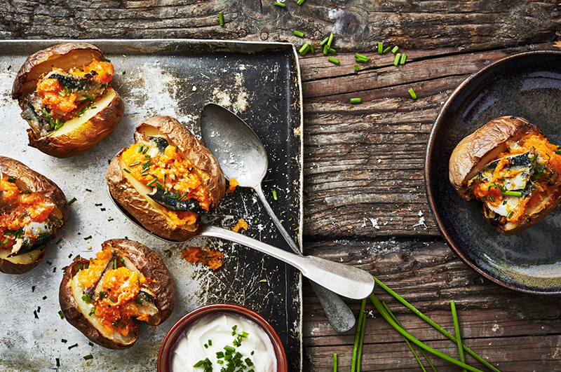 Avec pommes de terre, filets de sardines en boîte, courge butternut, échalote, yaourt nature, Mélange 4 épices, Huile d’olive, Parmesan râpé, Ciboulette, sel