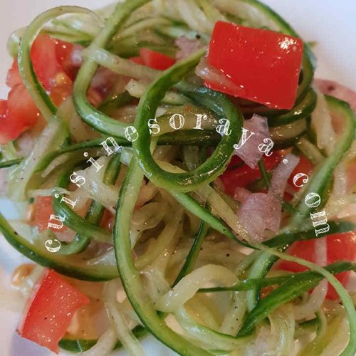 Des nouilles de concombre pas du tout calorique et très rapide! La tomate vas rendre son jus avec l'échalote, sel et poivre, pas plus .