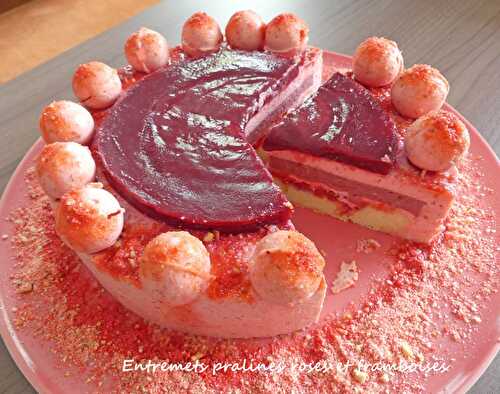 Un Entremets pralines roses et framboises constitué d'un biscuit financier, d'une mousse aux pralines et d'inserts aux framboises.