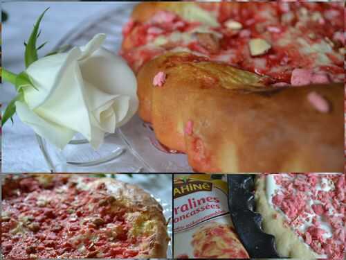 Une jolie recette de tarte briochée de ma copine Céline ! Pour une tarte, il faut : 250 g de farine 1/2 sachet de levure déshydratée 1 jaune d'oeuf 60 ml d'eau 80 ml de lait 1 pincée de sel 35 g de sucre 60 g de beurre mou 80 g de crème fraîche 200 g.
