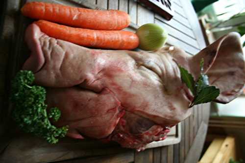 Du pâté (ou fromage) de tête de cochon Ingrédients : 1/2 tête de cochon, 2 oignons, 2 carottes, 1/2 bouteille de vin blanc de pays, 2.