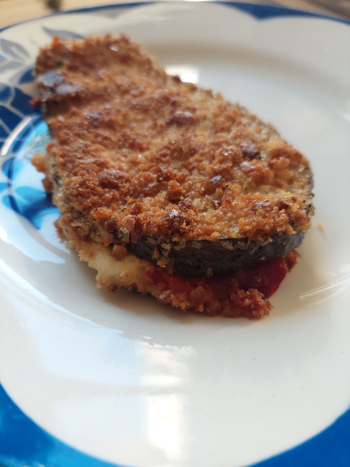 Une escalope de poule panée, bien dorée et accompagnés d'une sauce tomate cuisinée avec des poivrons, oignons, de l'ail, parfumée au thym, laurier et basilic, c'est juste ….