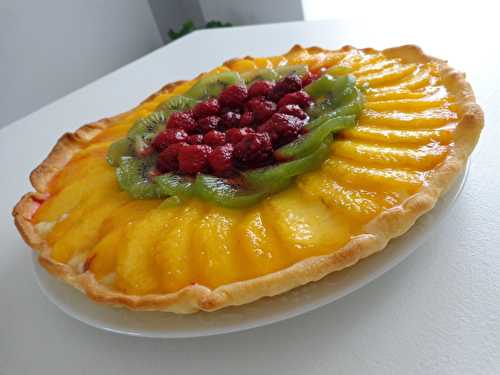 Pour 6 personnes Préparation: 20 mn Refroidissement: 1h Cuisson: 30 mn 1 pâte sablée 3 pêches 2 kiwis 25 framboises 3 cs de confiture d'abricot 1 cs de jus de fruits Pour la crème 50 cl de lait 1 gousse de vanille 1 oeuf + 2 jaunes d'oeufs 70 g de sucre.