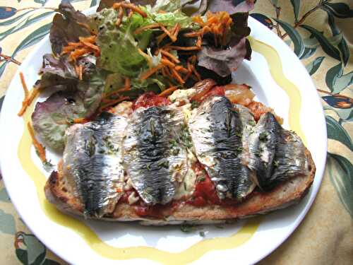 Ingrédients : 4 tranches de pain de campagne 1 oignon 200g de brocciu ou de ricotta 12 filets de sardines fraîches 1 boite de concassé de tomates 1 cuil à soupe d’huile d’olive du thym…