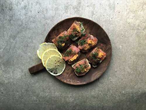 Ce délicieux saumon mariné façon gravlax se sert à l’apéritif en bruschetta provençales accompagnées de jaune d’œufs bien relevés.