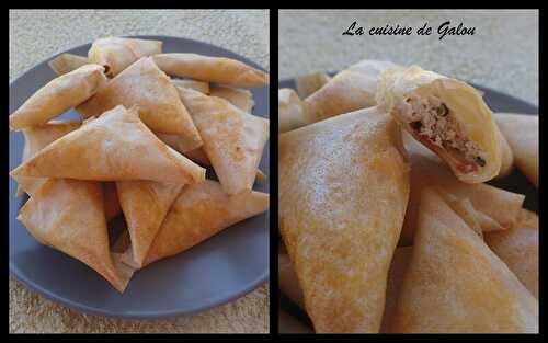 Ingrédients: 10 feuilles de brick 1 pot de caviar de tomates à l'ail 2 boite de thon moyen 1 pincée de piment d'espelette sel-poivre 20 g de beurre Préparation: Préchauffez le four à 220 °c coupez les feuilles en deux pour obtenir 20 samossas Égoutter.