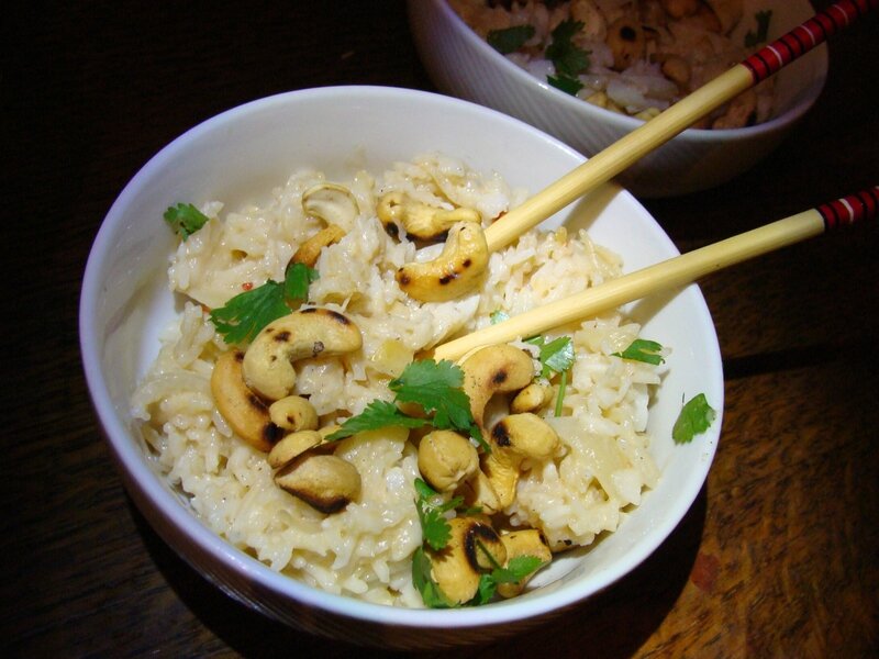 Pour accompagner de simples morceaux de poulet ou encore des côtes de porc, pensez à ce riz coco au poivron et noix de cajou, aussi parfumé que coloré