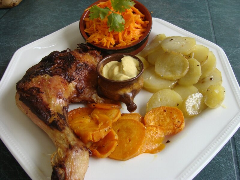 Ingrédients : pour 4 personnes 4 blancs de poulet Un peu d’huile d’olive ou de tournesol 1 belle cuillerée à café de curry en poudre 1 oignon 1 gousse d’ail 30 cl de lait de coco 600 g de patates douces 2 cuillerées à soupe de lait ou de crème fraîche.