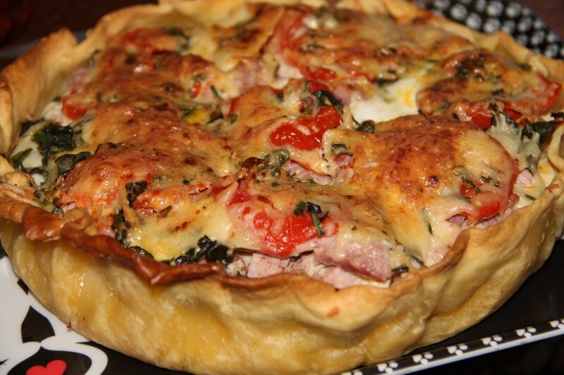 Quiche aux 2 fromages Ingrédients : 1 pâte feuilletée , 4 tranches de poitrine fumée, 4 oeufs, 20 cl de crème, 50 gramme d'emmental.