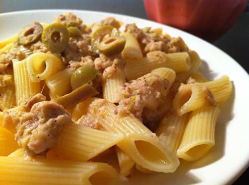 Pour 4 personnes : Ingrédients : -400 g de penne -300 g de thon à l'huile (poids égoutté) -100 g d'olives vertes -3 échalotes -1 cuillerée à soupe de moutarde à l'ancienne -parmesan -gros sel Préparation : -Faire bouillir un grand volume d'eau et le.