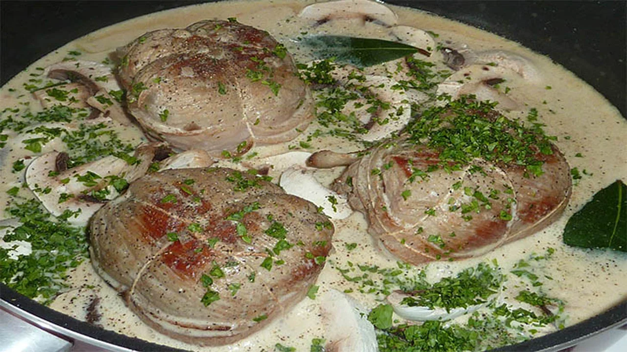 Paupiette de veau à la crème et au vin blanc, Les paupiettes sont constituées d’une tranche de viande garnie d’une belle farce et roulée .