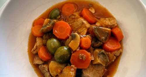 Une viande fondante à souhait : Avec sauté de porc, oignon, carottes, champignons, olives vertes, gousses ail, farine, concentré de tomates, sel, poivre.