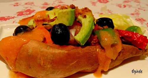 Patate douce cuite au four chili trempette légumière fauxmagée olives avocat laitue iceberg poivrons verts crus oigno.