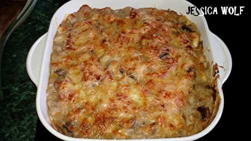 LASAGNES AUX CHICONS ( ENDIVES) Ingrédients pour 4 personnes : 8 feuilles de lasagnes ( qui cuisent au four sans cuisson préalable) 1 kg d'endives 500 g de champignons frais 50 cl de crème fraîche épaisse 4 tranches de jambon blanc sel, poivre gruyère.