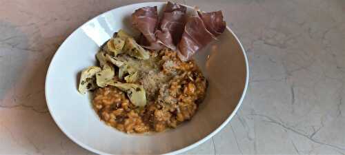 Pour le week-end, je vous propose une recette que j’aime tant, le risotto! En hiver, c’est chez moi la saison des artichauts, donc on en profite.