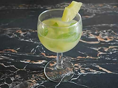 Pour 1 verre ballon : Au fond du verre, déposez : Une tranche d’ananas en conserve coupée en cubes (en garder pour la déco) et gardez le jus de la boite, 5 feuilles de menthe, 30 ml de rhum blanc, 30 ml de jus de la boite d’ananas, 30 ml de jus de citron.