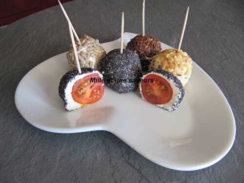 Une idée qui change pour un apéritif ça vous dit ? Eh bien rien de plus simples, des tomates cerises, du fromage de chèvre frais et des graines de toutes sortes.