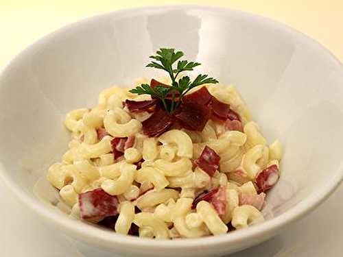 Et pourquoi pas avec des coquillettes :-) Pour 2 personnes : - 180 gr de coquillettes- 150 gr d'allumettes de lardons / jambon- 1.