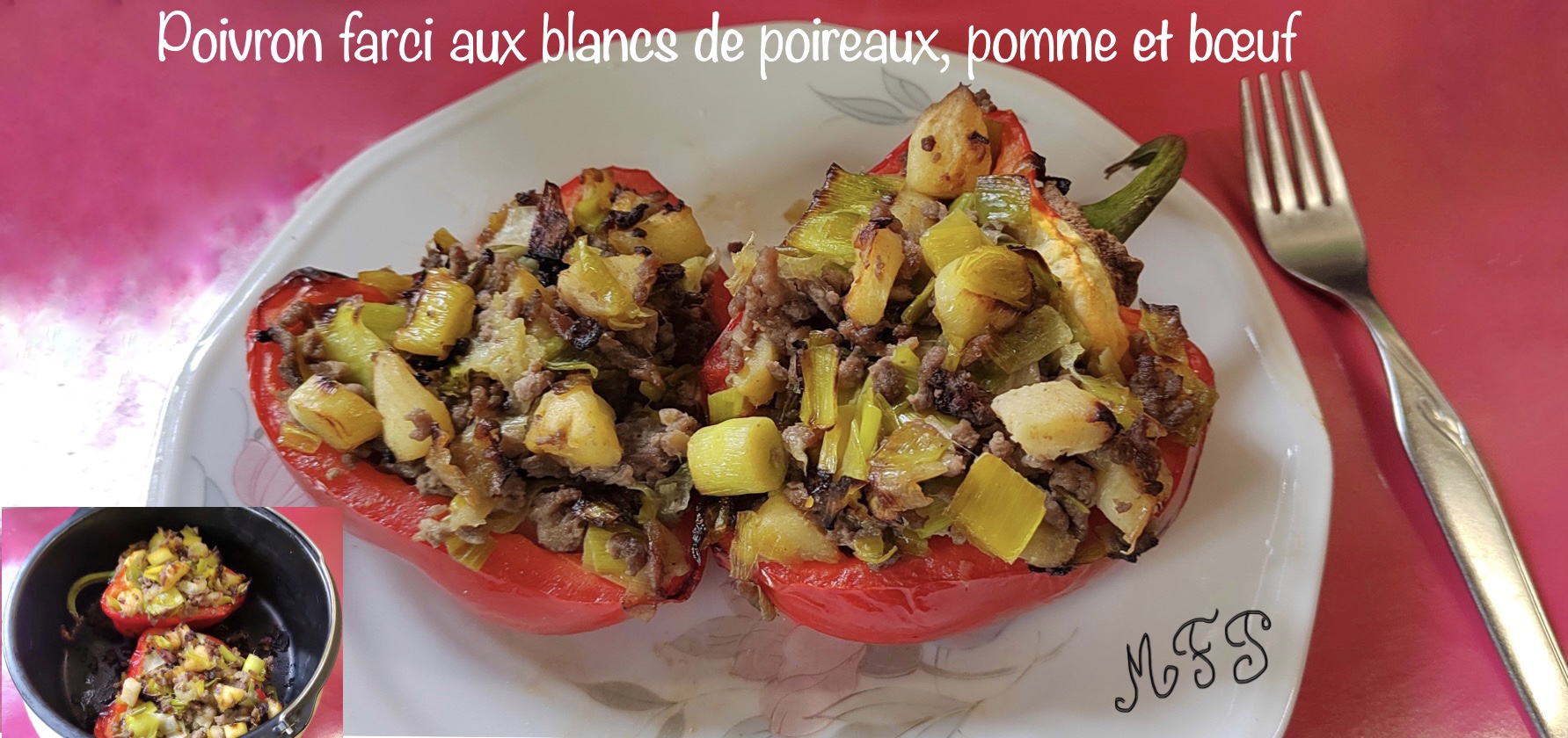Poivron, bœuf haché, blancs de poireaux, pomme , beurre