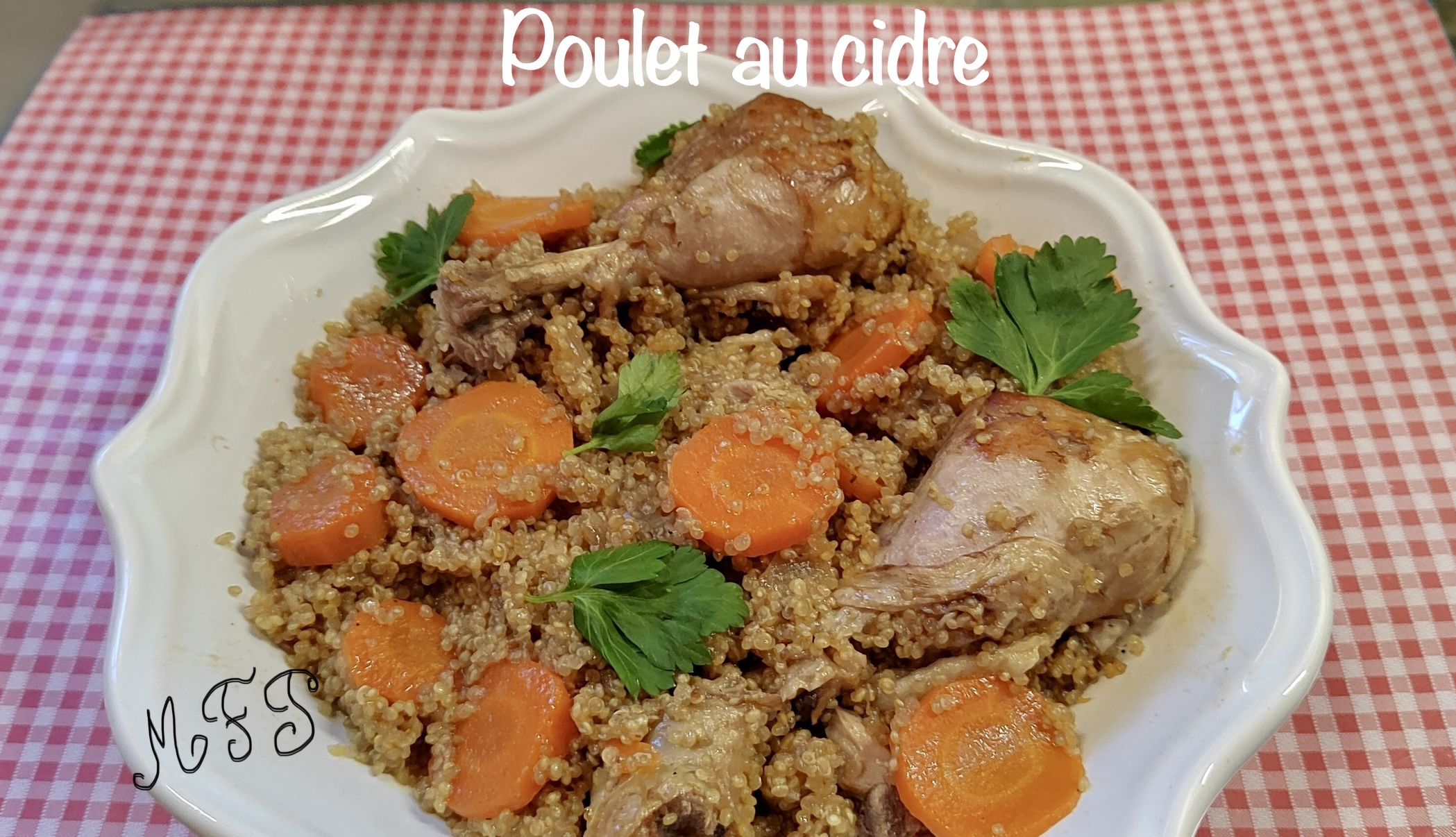 POULET AU CIDRE viande que vous pouvez remplacer par du lapin 1/oignon 1poulet coupé en morceau 1 pincée de thym Sel, poivre3/4 bouteille de cidre brut1 carotte500g champignons de Paris frais, à émincer (ou une petite boîte, si vous n’avez pas de frais)1.