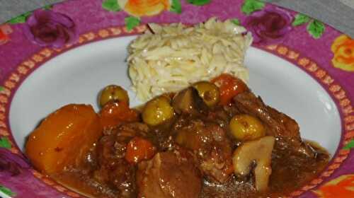 Bœuf bourguignon au cidre: j'ai voulu innover pour la recette du bœuf bourguignon en remplaçant le vin par du cidre et j'ai rajouté des olives.