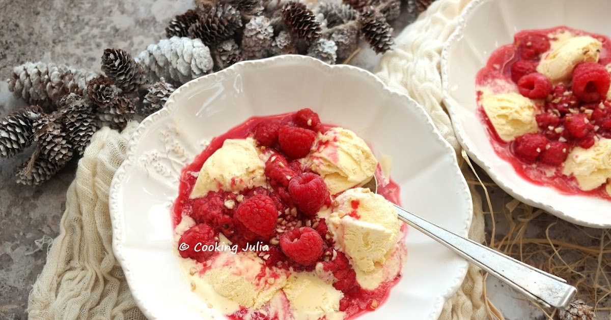 Une sorte de soufflé au citron, fourré de framboises, voici un Gratin chaud de citron aux framboises servi avec un coulis de framboise.