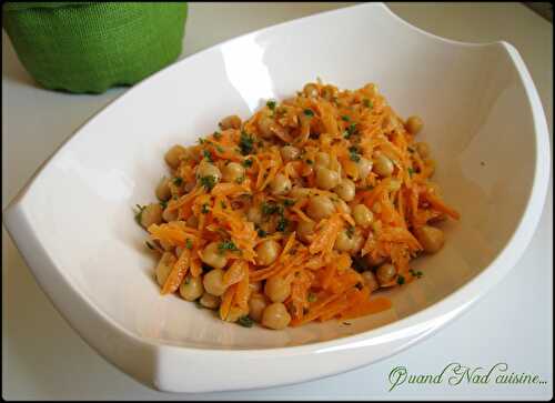 Une petite salade toute simple pour accueillir comme il se doit le soleil qui semble bien vouloir s’installer pour de bon… Pour 2 personnes: 1 petite boîte de pois chiches (265 g égoutté) 3 carottes 1 bonne cs de persil ciselé 1 échalote émincée Pour.