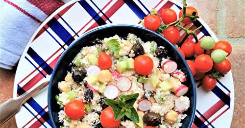 Il faut bien écouler la tonne de pois chiches que j'ai cuits dernièrement ! J'aime ce taboulé sans cuisson de la semoule, acidulé, avec d.