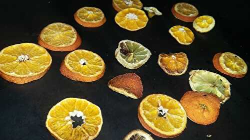 Ingrédients (1 personne): Des oranges, mandarines, citrons Préparation: Coupé les oranges en rondelles et les mettre sur du papier cuisson, puis laisser cuire 2h a 90° pour les faire séchés.