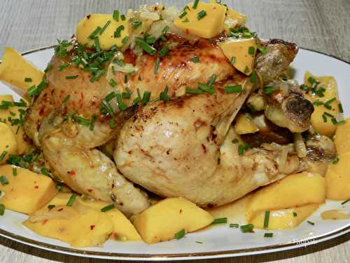 Pas mécontente d'avoir laissé aller mon imagination, j'avais envie d'un peu de douceur épicée Ingrédients: - 1 beau poulet - 1 grosse mangue - 4 fruits de la passion - 1 oignon émincé - 1 petit bouquet de ciboulette - 1 c.