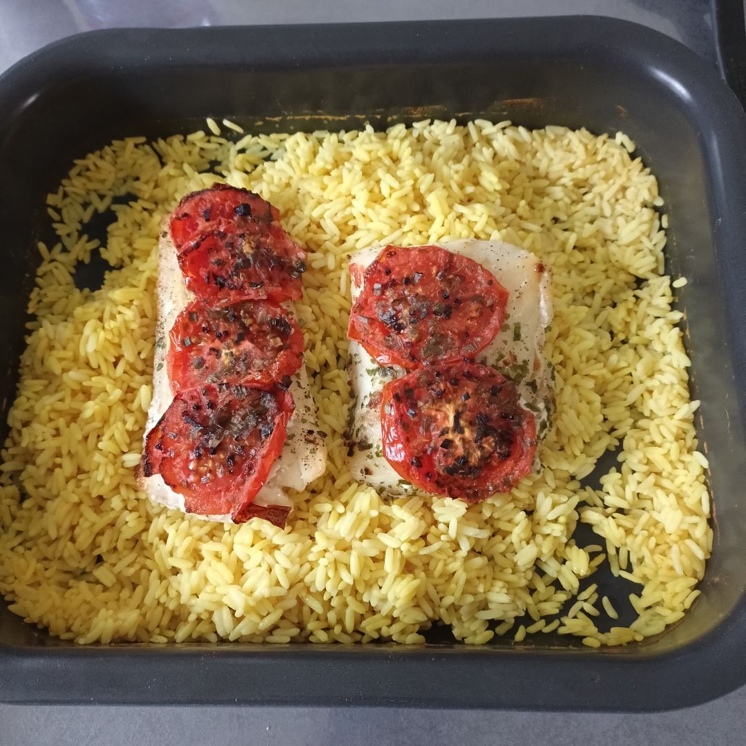Pour 2 personnes - 2 filets de julienne - Componée de tomate ICI - Huile d'olive, ail - Riz 3 couleurs Déposer les filets de julienne dans un papier, ajouter la compotée de tomate dessus.