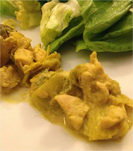Pour 4 personnes : Ingrédients : -400 g de blancs de poulet -400 g de poireaux -2 échalotes -2 gousses d'ail -20 cl de vin blanc -15 cl de bouillon de volaille -20 cl de crème fraîche -curry -beurre Préparation : -Faire revenir les échalotes émincées,.
