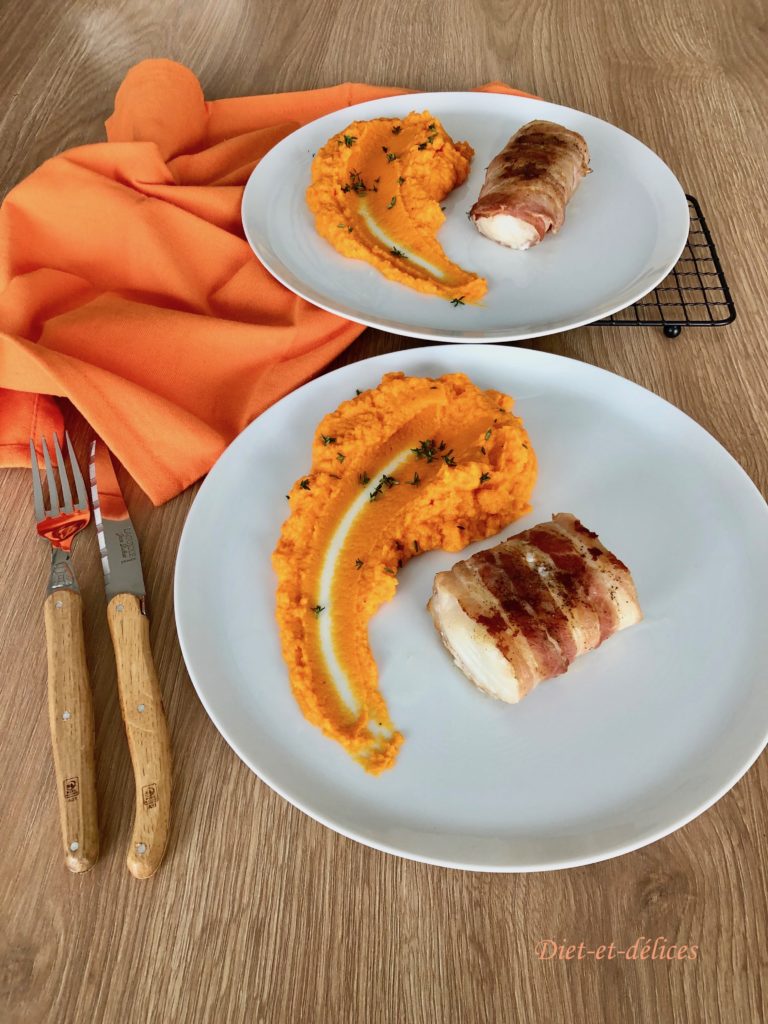 Voici une assiette bien colorée avec ce dos de cabillaud en croûte de lard fumé et sa purée de courge butternut.