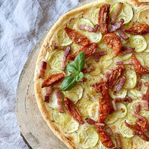 Ma passion pour les tartes est de retour ! La tarte boursin, courgette, lardons et tomate confites, un délice et difficile de faire plus simple !