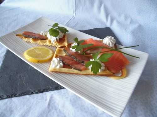 Gaufres à l’ail doux et chiffonnade de saumon fumé Recette de Michèle du blog « Croquant-Fondant… Gourmand » http://www.