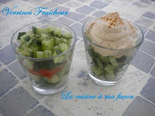 Pour notre entrée de ce soir, j'ai fait des petites verrines : TARTARE DE CONCOMBRE avec des tomates et une sauce vinaigrette.